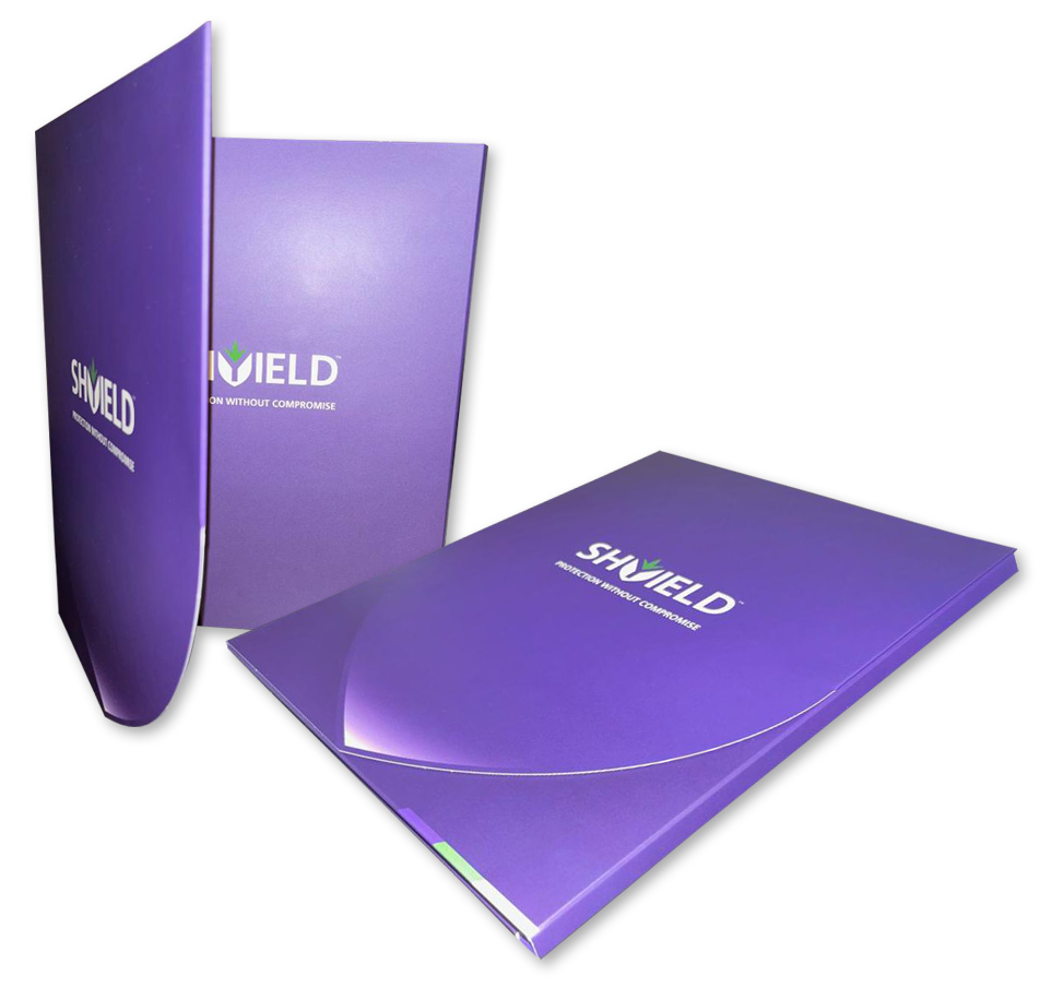 A custom-designed 3-panel pocket folder printed with spot UV and a magnetic closure to house product literature.